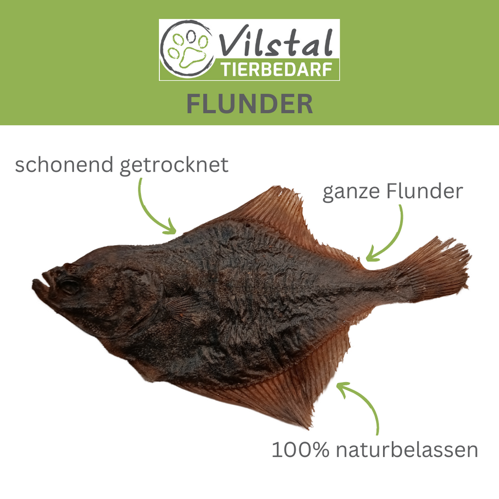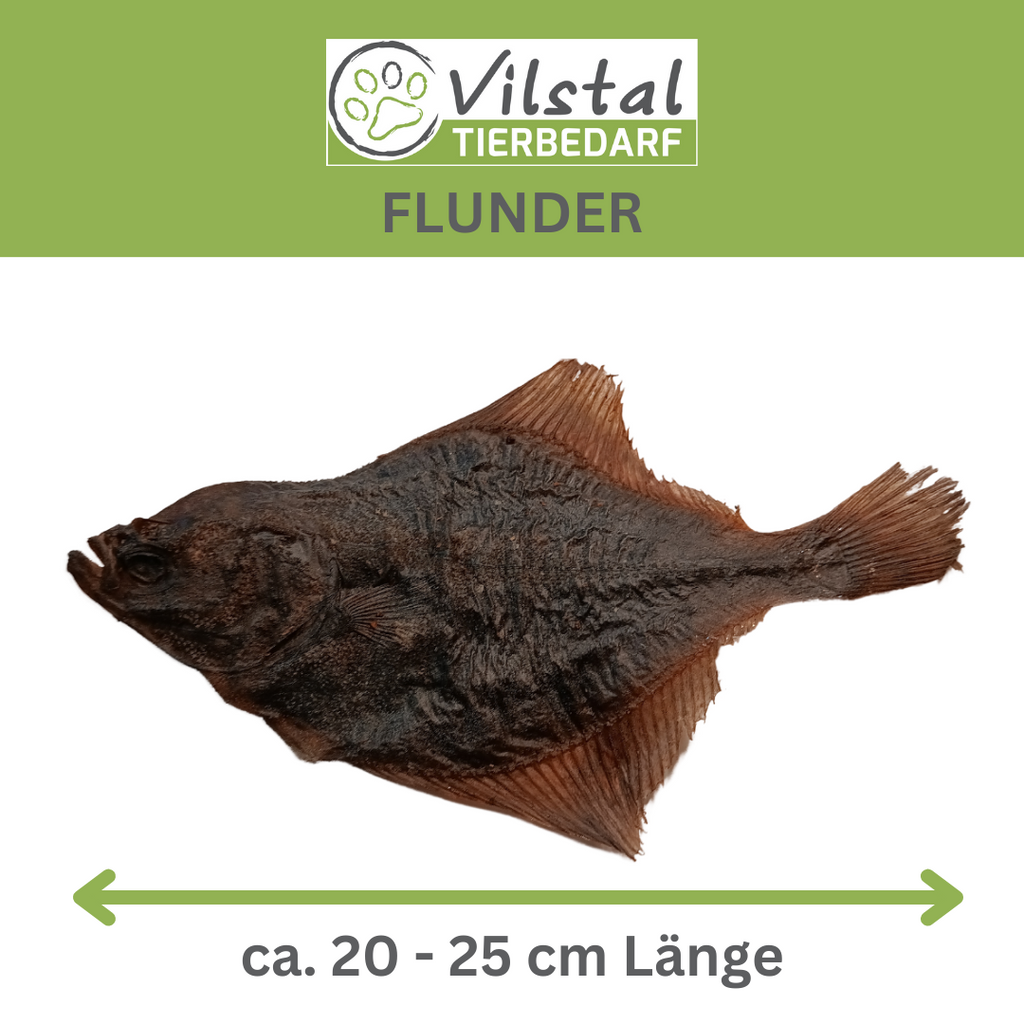 Bitte beachtet, dass in ganzen Fischen Gräten enthalten sind. Für mittelgroße und große Hunde stellt dies im Normalfall kein Problem dar. Jedoch sollten zur Sicherheit die Hunde beim Kauen beaufsichtigt werden. Für Hunde, die Futter nahezu unzerkaut herunterschlingen, sind die Flundern daher weniger geeignet. Für Hunde, die sich gerne mit einem Kauartikel beschäftigen, stellen die Flundern eine hervorragende Abwechslung dar. Sie können auch vor der Fütterung zerteilt werden.