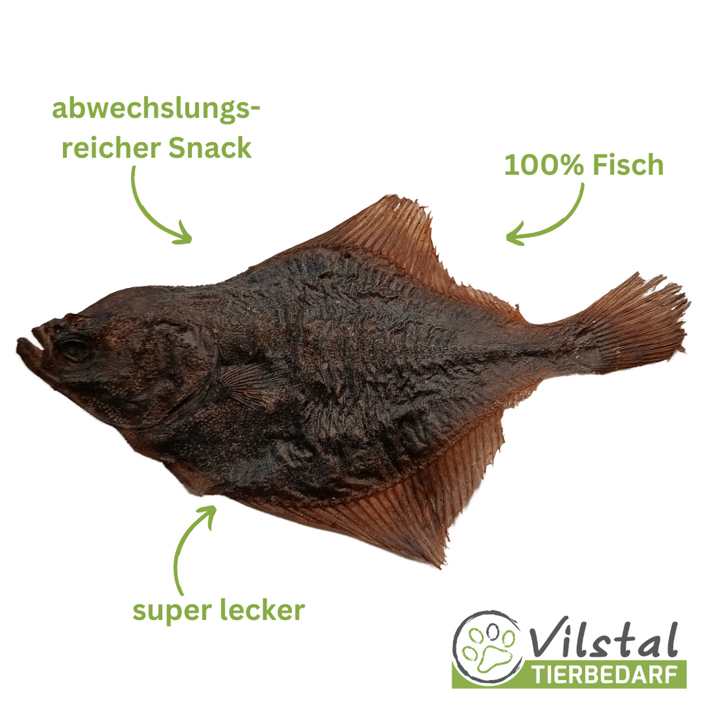 Hier kommt der besondere Kausnack für Hunde: Ganze, getrocknete Flundern!