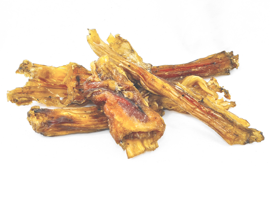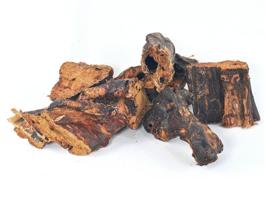 In den Tüten ist eine Mischung aus: Rindernackensehnen, Rinderkopfhaut, Rinderohr, Rinderhufe, Rinderkopfhaut mit Fell, Rinderlunge, Rindernase weiß