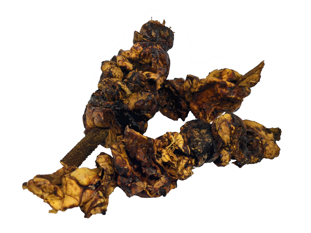 Unsere getrockneten XL-Schaschlik-Spieße werden in Handarbeit aus einem Stück Rinderpansen ("Spieß") und mehreren Rinder-Lungenbrocken zusammengesteckt. Ihr Hund kann also bedenkenlos den ganzen "Spieß" aufessen und genießen.