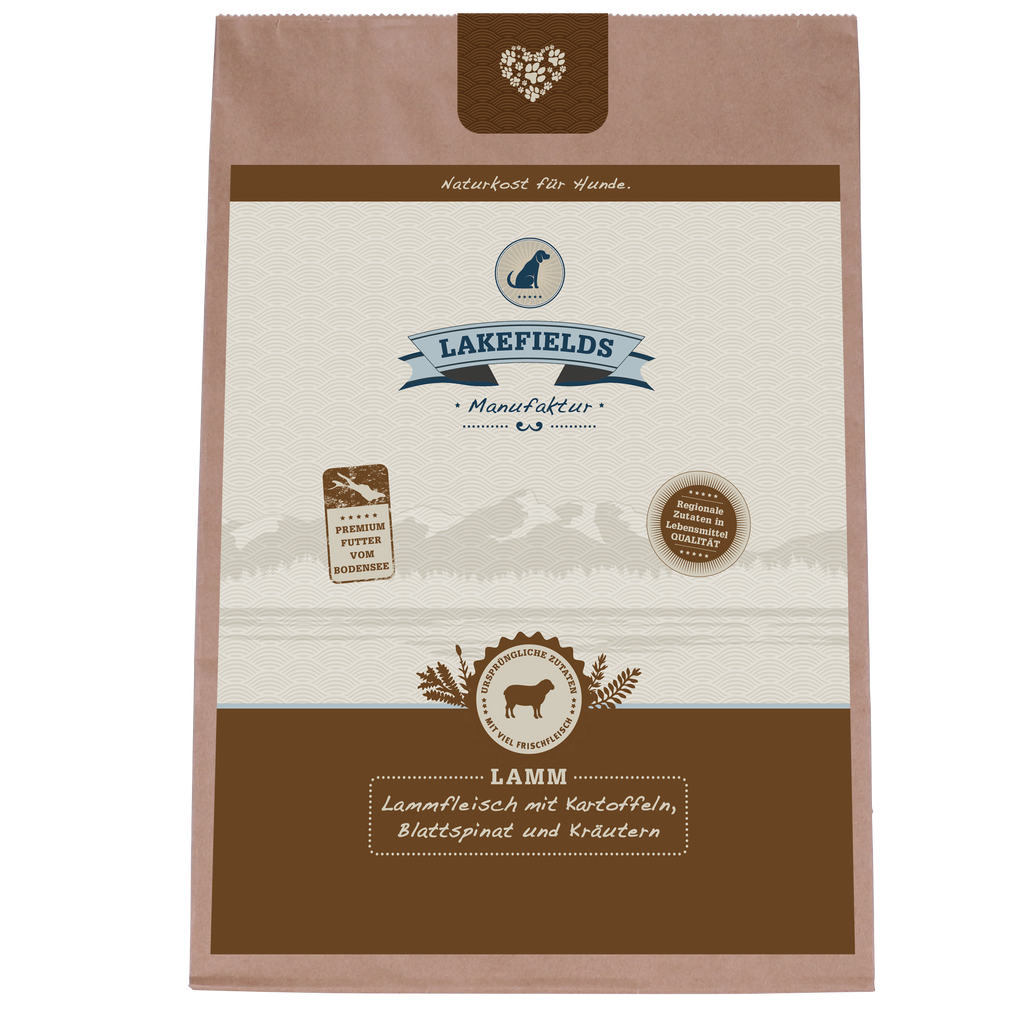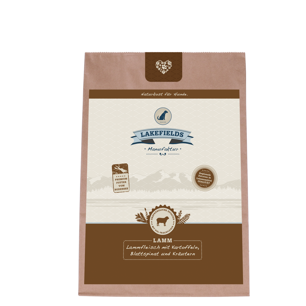 Weidelamm 68% (Muskelfleisch, Herz, Leber), Kartoffelflocken 21%, Zucchini 1,6%, Karotten 1,3%, Äpfel 1,2%, Sellerie 1,2%, Fenchel 1,1%, Spinat 1,0%, Leinsamen 0,6%, Rote Beete 0,4%, Eierschalenpulver 0,5%, Mineralerde 0,5%, Distelöl 0,4%, Bierhefe 0,4%, Hagebutte 0,3%, Seealge 0,2%, Minze 0,1%, Liebstöckel 0,1%, Rosmarin 0,1%, Calcium/Phosphor-Verhältnis 1,3 : 1,0