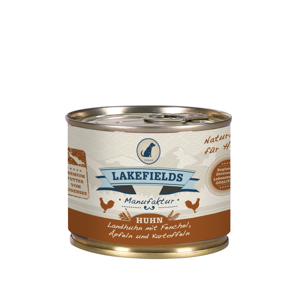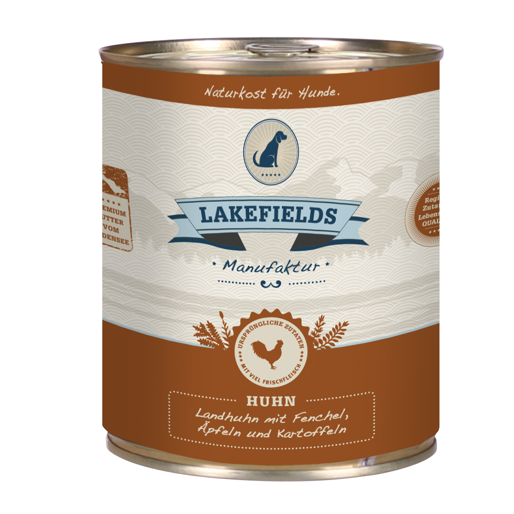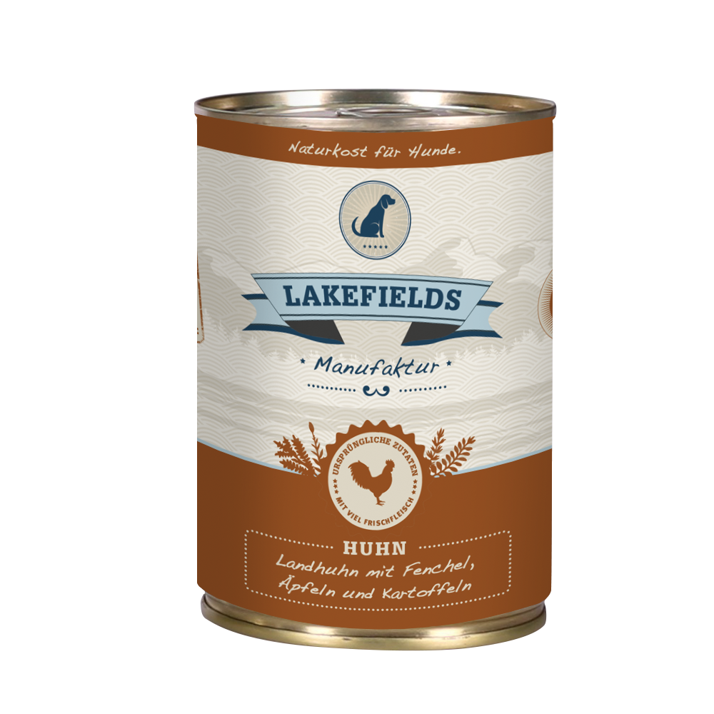 In unserem Hühner-Menü wird ausschließlich Hühnerfleisch (61%) als einzige Proteinquelle verwendet. Damit ist es auch für ernährungssensible Hunde geeignet. Hühnerfleisch ist fettarm und reich an Vitamin B6 und B12, Niacin, Kalium, Magnesium, Eisen sowie Zink. Durch Zugabe von frischem Obst und Gemüse wie Fenchel, Karotten, Kartoffeln und Äpfel entsteht eine gesunde, vollwertige und bekömmliche Mahlzeit für Ihren Hund. Das Dosenfleisch-Menü Huhn ist ein Alleinfutter für Hunde.