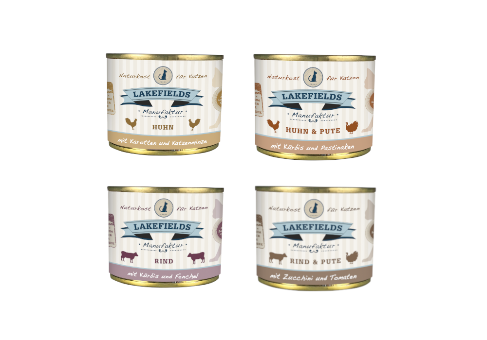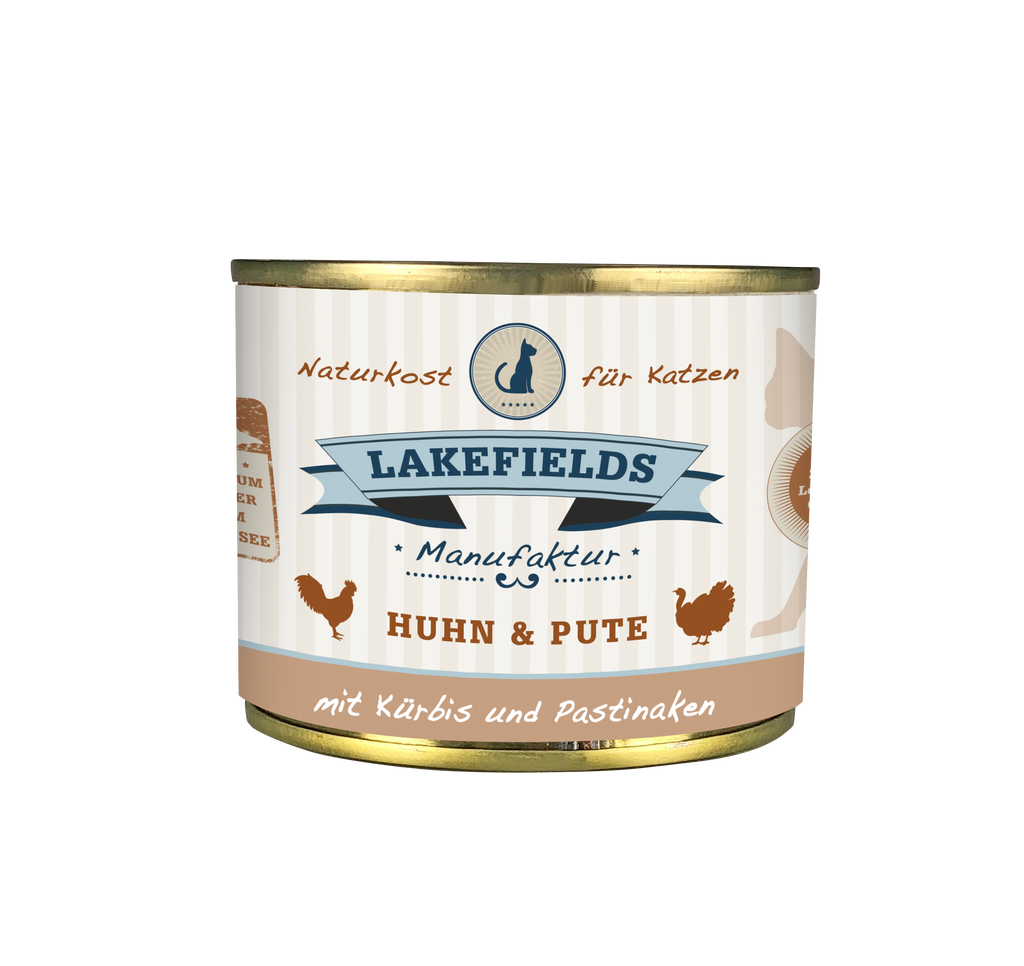 Ein Menü für Leckermäuler auf vier Samtpfoten, die sich nicht mit lediglich einer Fleischsorte im Napf zufrieden geben möchten, ist das Nassfutter Huhn und Pute mit Kürbis und Pastinaken. Wir garen hierfür in unserer Art Schnellkochtopf je Dose 69 % Muskelfleisch, 12 % Hälse und 8,5 % Leber von Huhn und Pute sowie etwas Kürbis (3,5 %), Pastinake (2 %) und Fenchel (2 %). Auch hier darf wie bei unseren weiteren Nassfuttersorten für Katzen unsere wertvolle Ergänzung aus Mineralerde, Seealgen, Hagebutten, Katzenminze und Weizenkeimöl natürlich nicht fehlen.